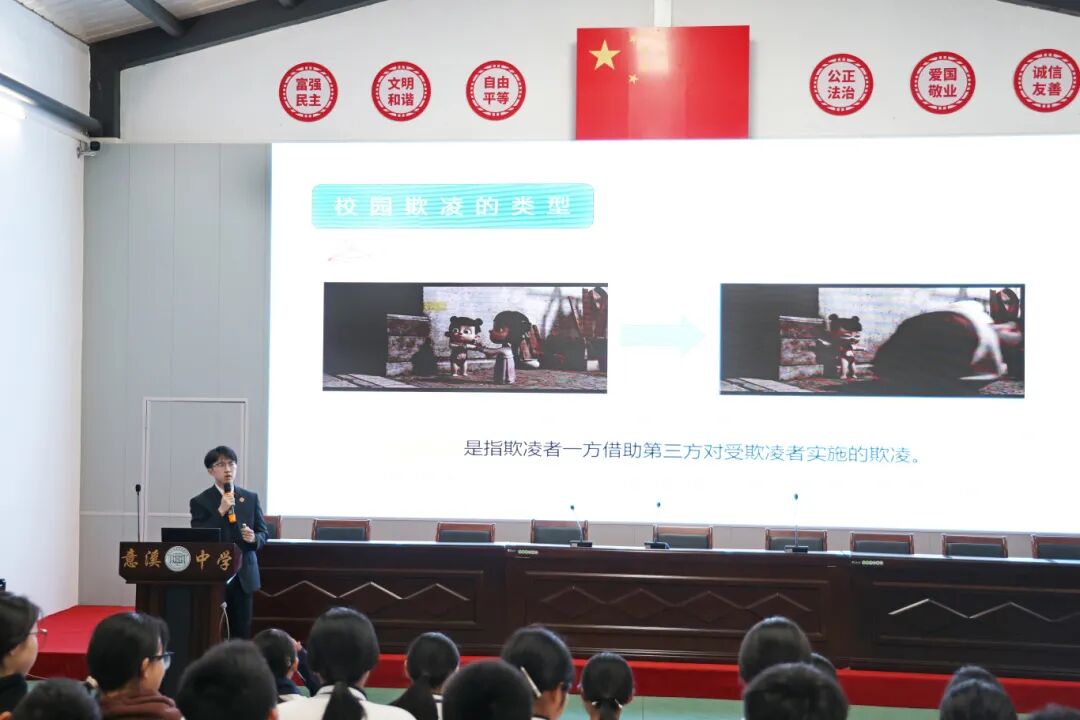在湘桥区意溪中学,我院检察官同样积极发挥法治副校长职能,深入组织开展法治进校园活动,为该校初一学生精心策划了“预防校园霸凌”普法课堂。检察干警以近期网络热议的热点案件为切入点,教导同学们在面对校园欺凌时,既要敢于说“不”,也要掌握好方式方法,要学会运用法律的武器,及时向家长、老师、公安机关求助,真正保护自己不受侵害。