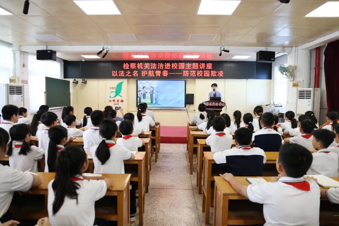 为强化青少年法治观念,筑牢校园安全防线,有效预防和遏制校园欺凌行为,近日,市、区两级检察院组织干警到湘桥区实验学校开展普法教育宣讲活动及专项座谈会。 两级院检察官以法治副校长的身份走进湘桥区实验学校,就检察机关如何更好地开展法治副校长工作、如何加强未成年人安全教育和保护等方面与该校参会人员进行深入交流。双方一致表示将凝聚检校合力,共同为学生的成长成才创造良好的法治校园环境。 我院干警结合未成年人司法实践与学生身心认知特点,以“案例+法条+实操”模式讲解校园欺凌相关法律知识,通过具体场景描述打破“小打小闹不算欺凌”的误区,明确蓄意侵犯他人人格尊严、危害身心健康的行为均属校园欺凌且会造成深远心理伤害。同时结合《未成年人保护法》等法律法规,以多起真实案例展现欺凌从萌芽到升级的过程及法律后果,强调“未成年”并非违法犯罪的“保护伞”,实施欺凌者将面临纪律处分、治安处罚乃至刑事追责,教育引导学生摒弃侥幸心理,严守法律底线。